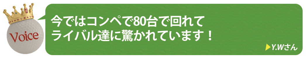 仕組みで直すとの評判通りスイングは今までと全く違うポイントから当たりや飛距離がすぐに変わり、わずか2ヶ月ほどで90台を連続して出せるようになり、この結果に満足しています。